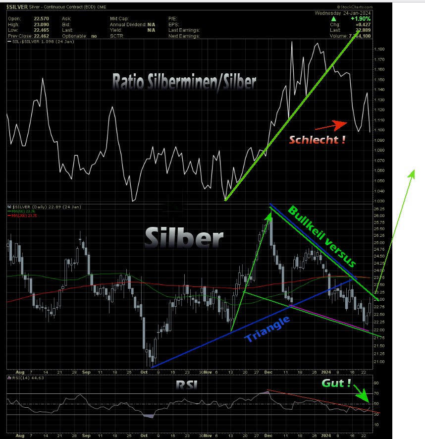 Mmmh ! Die stärkere Reaktion die ich für letzte Woche eigentlich erwartet hatte ist ausgeblieben. Mag daran liegen , dass der RSI bei den Minen noch nicht ganz ausgereizt ist. Aber wir sind nahe dran. Bei Silber , btw. der RSI mit bullischer Divergenz. Im Silberchart , wenn man ins 'Große Ganze' etwas reinzoomt ...