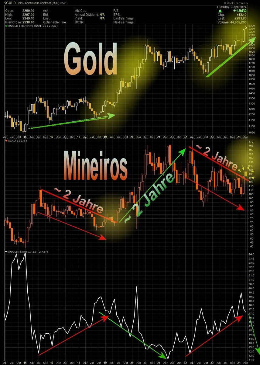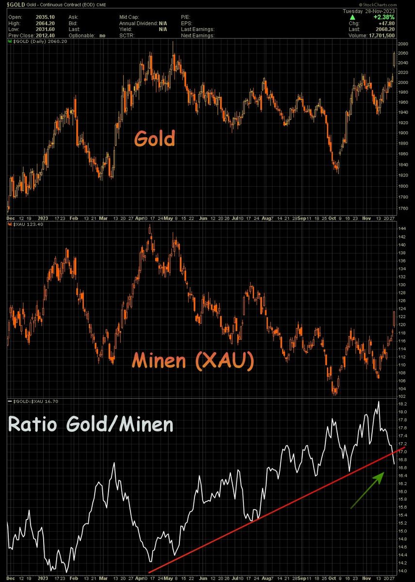 Der 'Ausbruch' über den Schlüsselwiderstand und über den Abwärtstrend ist den Minen JETZT endlich gelungen. Gold stößt sich das Köpfchen am Aufwärtstrend und das Ratio befindet sich auf dem 'richtigen Weg' nämlich nach unten. Ich habe im November die Performance von Gold in 2017 und 2018 mit dem Preistrend der Minen verglichen und auf richtungsmäßige Unterschiede hingewiesen. 2022 und 2023 hatten wir eine ähnliche Divergenz: hier nochmal der Chart vom November:
