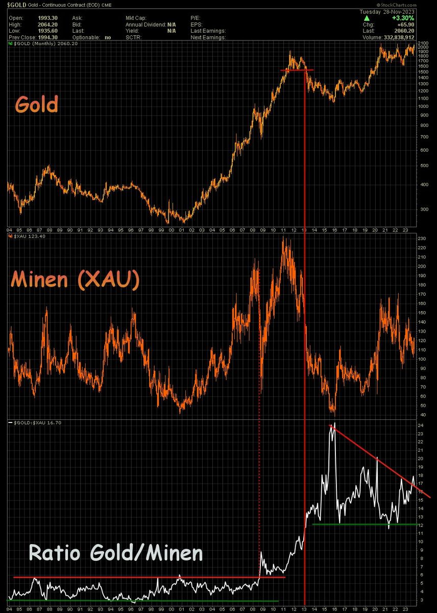Der 'Ausbruch' über den Schlüsselwiderstand und über den Abwärtstrend ist den Minen JETZT endlich gelungen. Gold stößt sich das Köpfchen am Aufwärtstrend und das Ratio befindet sich auf dem 'richtigen Weg' nämlich nach unten. Ich habe im November die Performance von Gold in 2017 und 2018 mit dem Preistrend der Minen verglichen und auf richtungsmäßige Unterschiede hingewiesen. 2022 und 2023 hatten wir eine ähnliche Divergenz: hier nochmal der Chart vom November: