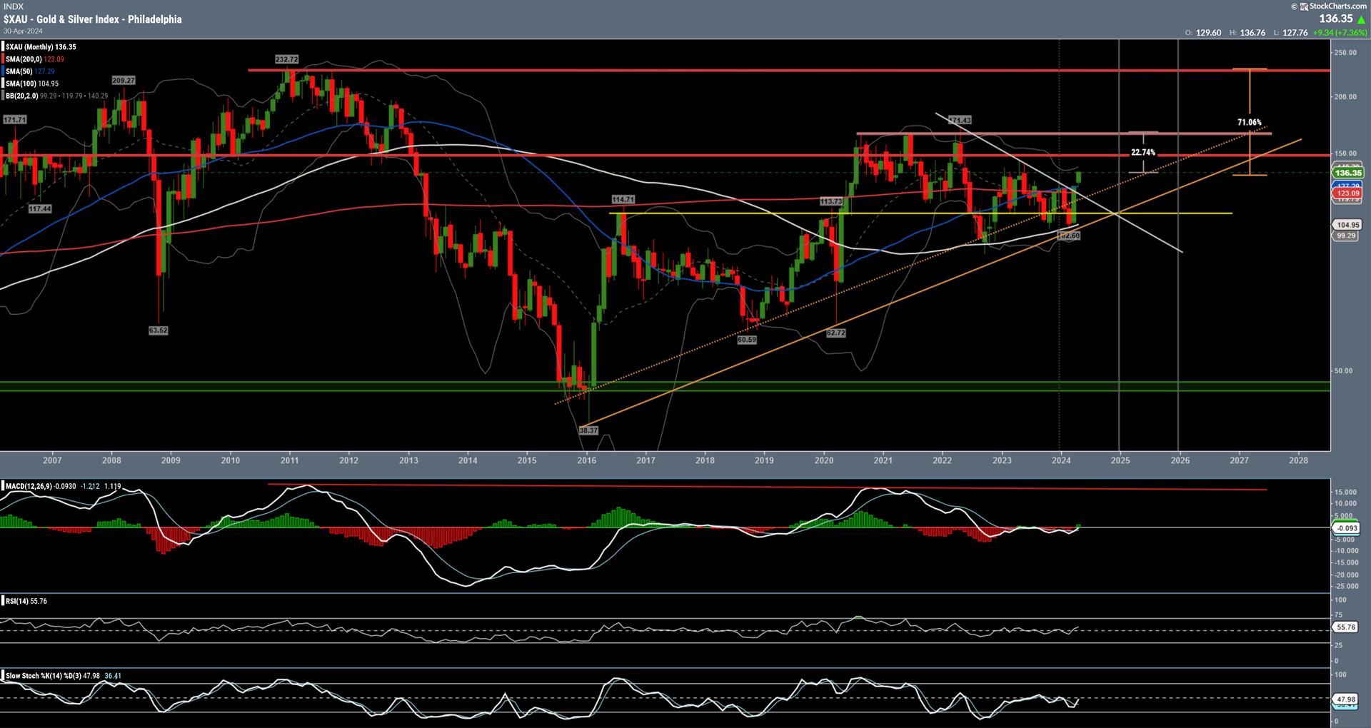Charttechnisch sehen wir am rechten Rand ein fallendes Dreieck, das bei Bruch der (grünen) Nackenlinie durchaus das Paotential aufweist in die Nähe der alten 30 Jahre Range zurück zu kehren.