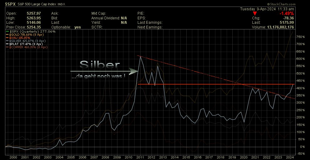 ...man sich vergegenwärtigen muss, dass die Metallperformance nicht solitär da steht ! Alles, alles, alles bewegt sich in diese Richtung. Energie, Industriemetalle, sogar die Softs (landwirtschaftliche Produkte). Crackup-Boom ahead ? Oder schon mitten drin ? ![]()