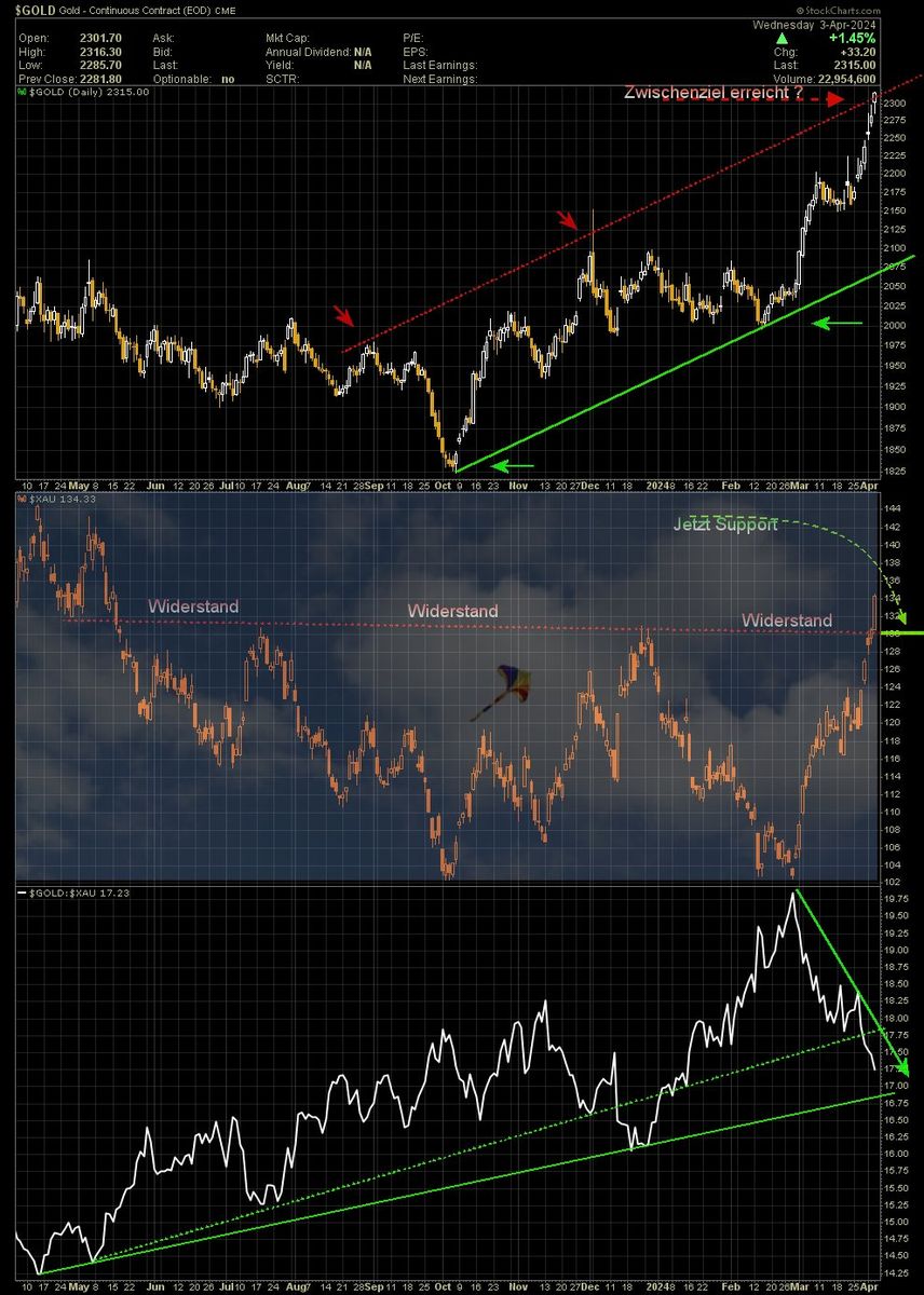 Der 'Ausbruch' über den Schlüsselwiderstand und über den Abwärtstrend ist den Minen JETZT endlich gelungen. Gold stößt sich das Köpfchen am Aufwärtstrend und das Ratio befindet sich auf dem 'richtigen Weg' nämlich nach unten. Ich habe im November die Performance von Gold in 2017 und 2018 mit dem Preistrend der Minen verglichen und auf richtungsmäßige Unterschiede hingewiesen. 2022 und 2023 hatten wir eine ähnliche Divergenz: hier nochmal der Chart vom November: