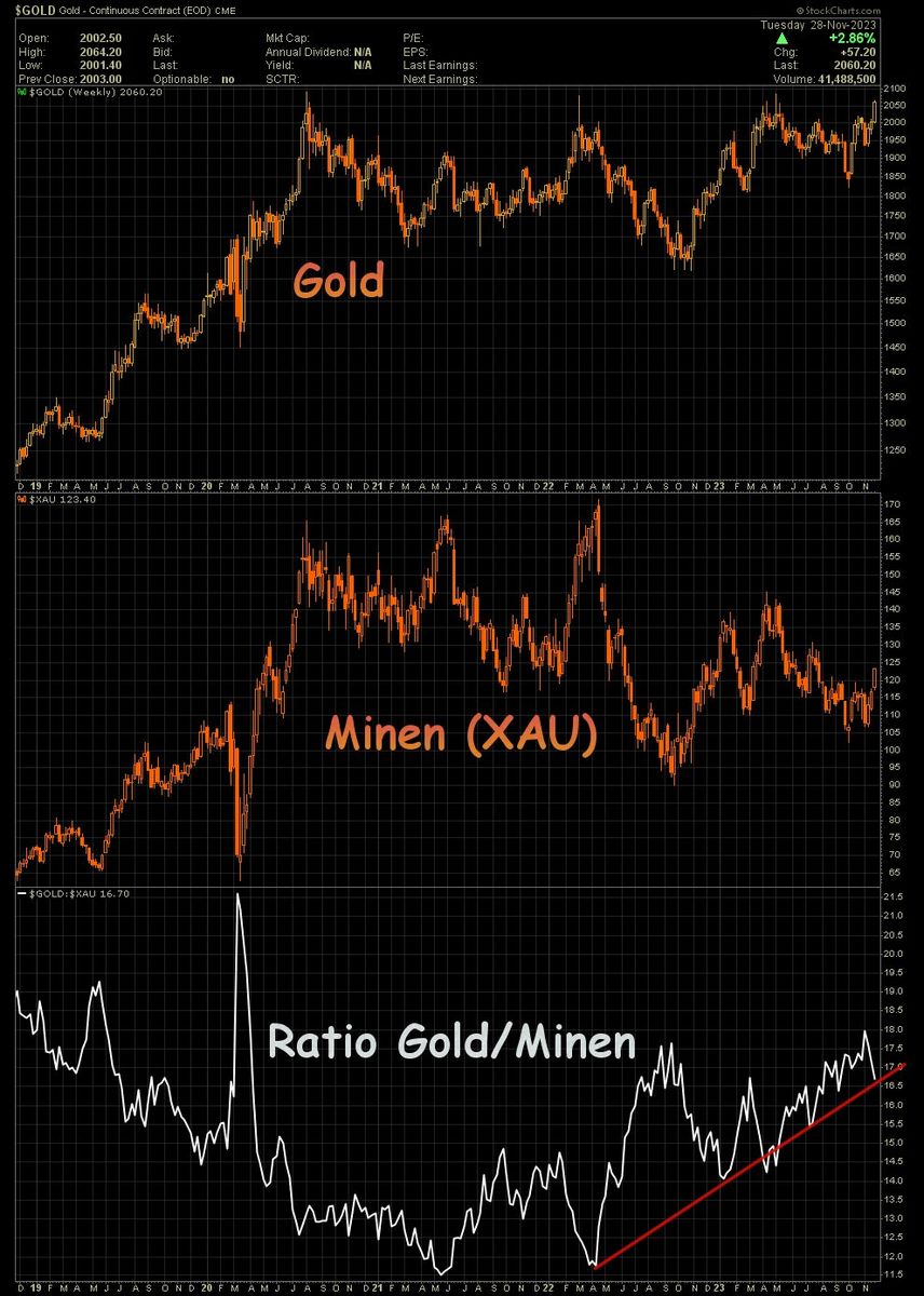 Der 'Ausbruch' über den Schlüsselwiderstand und über den Abwärtstrend ist den Minen JETZT endlich gelungen. Gold stößt sich das Köpfchen am Aufwärtstrend und das Ratio befindet sich auf dem 'richtigen Weg' nämlich nach unten. Ich habe im November die Performance von Gold in 2017 und 2018 mit dem Preistrend der Minen verglichen und auf richtungsmäßige Unterschiede hingewiesen. 2022 und 2023 hatten wir eine ähnliche Divergenz: hier nochmal der Chart vom November:
