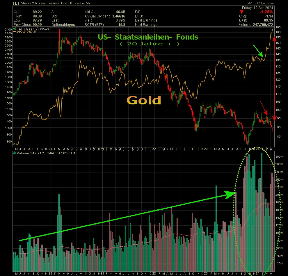 Die Geldflut hebt alle Preise und Löhne, was nichts anderes bedeutet, als dass der US $ - und alle Währungen - gegen Güter real abwerten. Auch ein Abverkauf der Aktien stützt den Bondmarkt kaum noch - Bonds verlieren im Angesicht der Bond-Flut ihre Funktion als "sicherer Hafen"! - Gold tritt an diese Stelle! Das haben noch lange nicht alle erkannt.