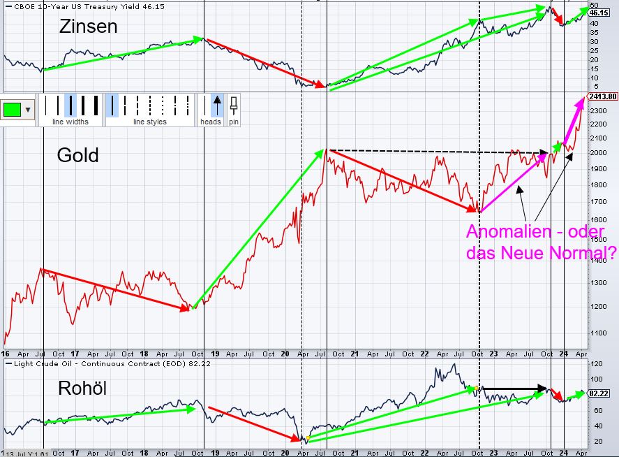 Bis zur Gestrichelten Senkrechten, Okotber 2022, lief im Grunde Alles "fast normal": Zinsen gehen rauf, Gold geht runter. Der gewohnte Automatismus. Dazu läuft der Ölpreis mit den Zinsen, bzw. diesen ein wenig voraus - und ab und zu kommt beim Öl eine Störung durch Corona oder Krieg dazu.