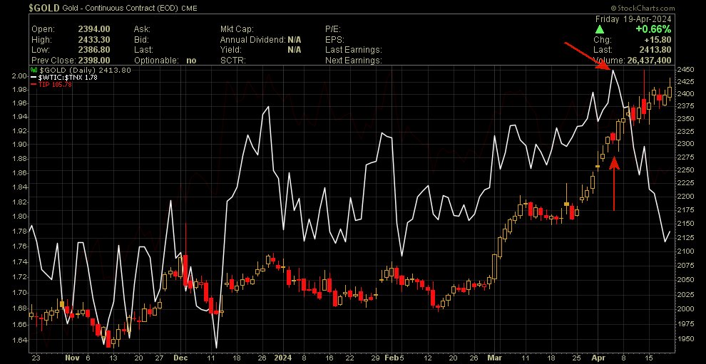 Im Kleinen (Tageschart) läuft alles wie erwartbar bis Anfang April . Danach fällt das Ratio (Zinssenkungsenttäuschung --> Zinsen steigen schneller als Öl) und Gold steigt dennoch weiter.