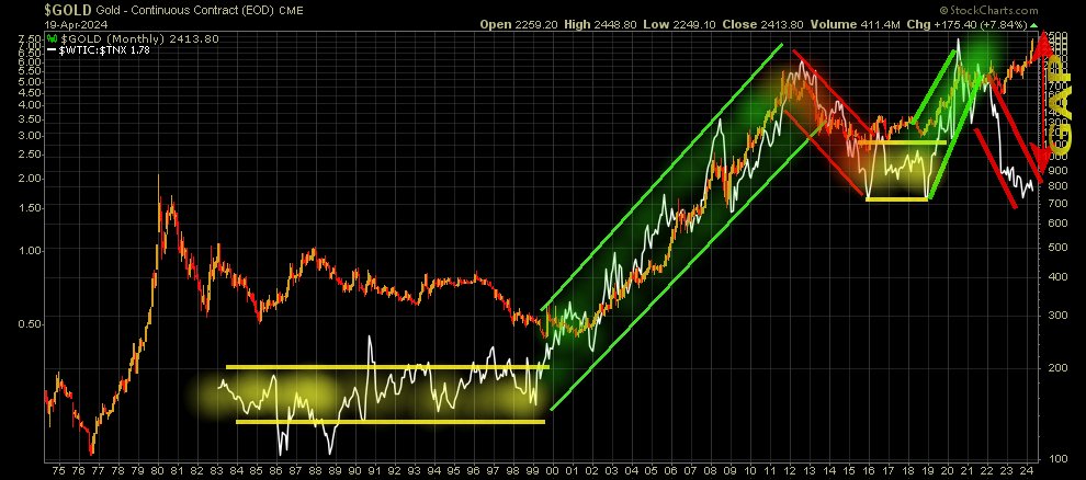 Bis zur Gestrichelten Senkrechten, Okotber 2022, lief im Grunde Alles "fast normal": Zinsen gehen rauf, Gold geht runter. Der gewohnte Automatismus. Dazu läuft der Ölpreis mit den Zinsen, bzw. diesen ein wenig voraus - und ab und zu kommt beim Öl eine Störung durch Corona oder Krieg dazu.