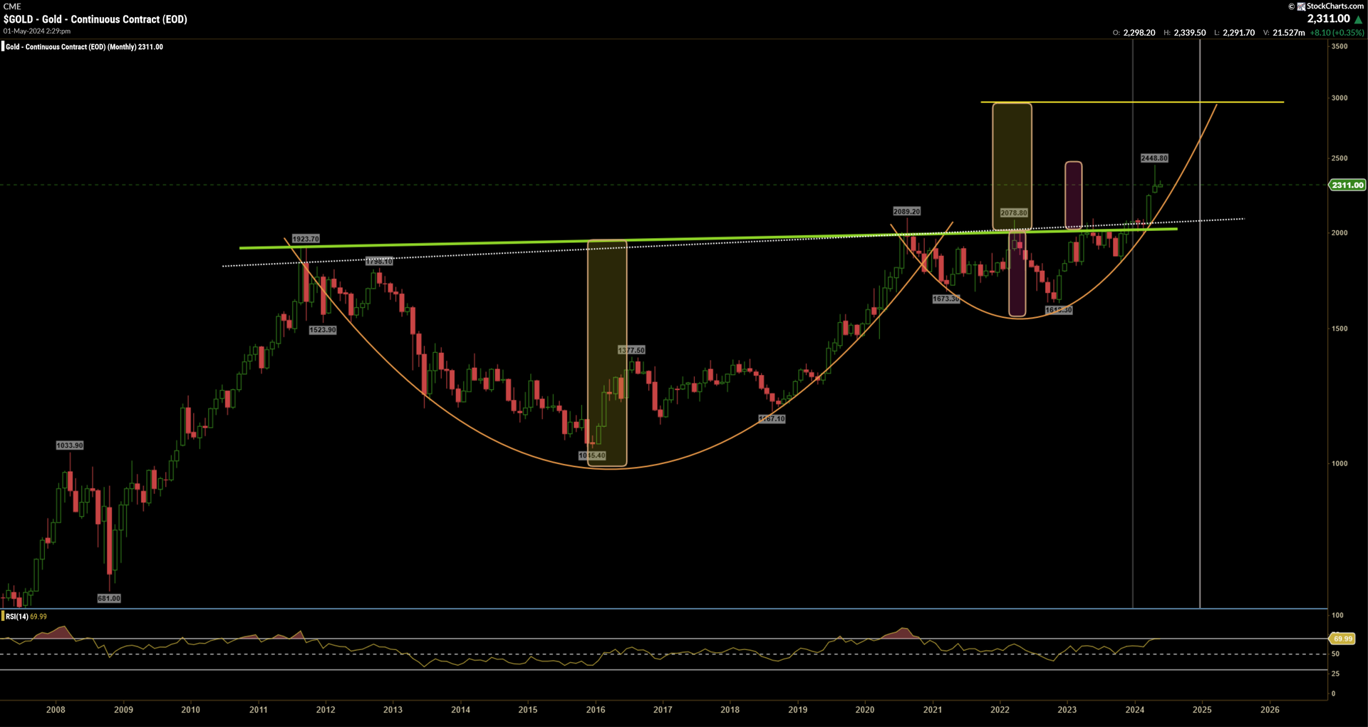 Monatschart: hier sind wir noch nicht einmal im ÜBERKAUFT-Bereich. Schau Dir die Indikatoren 2001 - 2011 an !!! RSI und SlowSto rekurrieren nur in den mittleren Bereich. (= Bullmarkt-Action !)