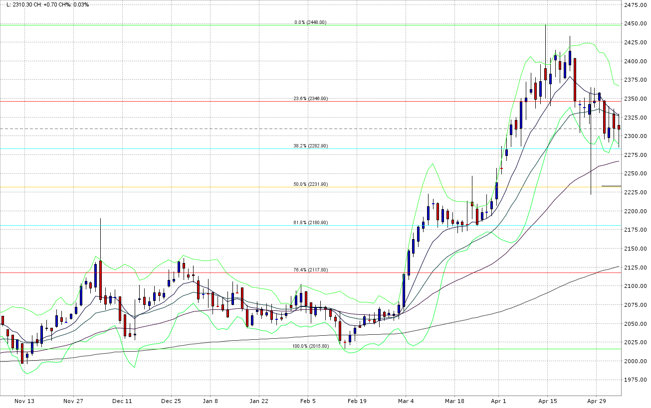 Im Tageschart ( Chart 1) ist ersichtlich, dass wir ausgehend vom Februar Tief ziemlich exakt das 38% retracement bereits erreicht haben. Wenn wir davon ausgehen, dass Gold eine symmetrische a-b-c Korretur (a = c) machen möchte, dann würde die c bis in den Bereich 2223 gehen. In diesem Bereich (2232) befindet sich das 50% retracement und auch das 38% retracement, wenn man das Oktober Tief als Basis nimmt. Somit: Entweder nächste Woche wieder aufwärts oder zuerst noch runter bis in den Bereich 2223-2232. Gut zu sehen, wie relevant auch die EMA's sind. Seit Anfang März ist der 9 EMA die guideline, am 21. April wurde sie signifikant durchbrochen und ist jetzt Widerstand.