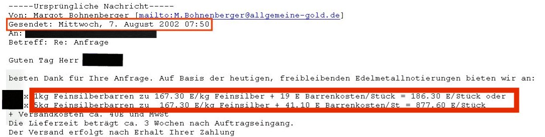 letzten Herbst und vorletzte Woche sind noch mal 10+ kg "zugestiegen" für 800 €/kg fein (eine kleine Position 999er für 250 x 86 Cent/g)