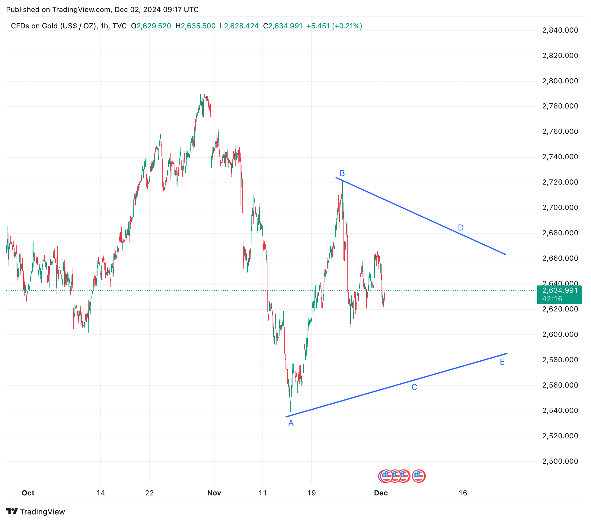 Falls der Kurs demnächst unter die 2.620 $ geht, sollten wir hoffen, daß es kein Doppeltief gibt, sondern eine klassische abc - Korrektur mit c tiefer als a.