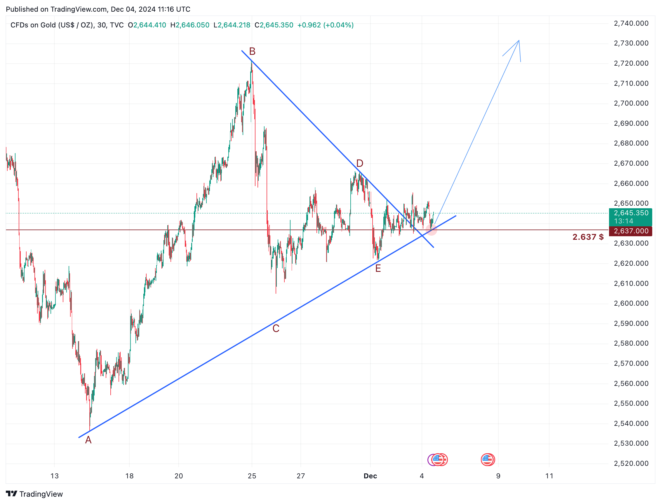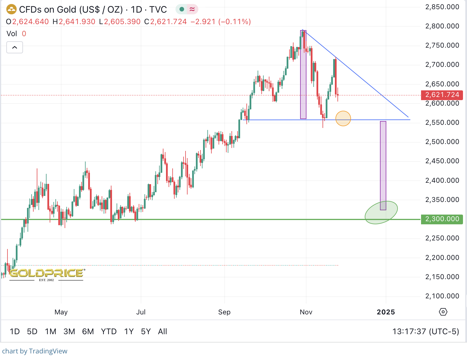 Falls der Kurs demnächst unter die 2.620 $ geht, sollten wir hoffen, daß es kein Doppeltief gibt, sondern eine klassische abc - Korrektur mit c tiefer als a.