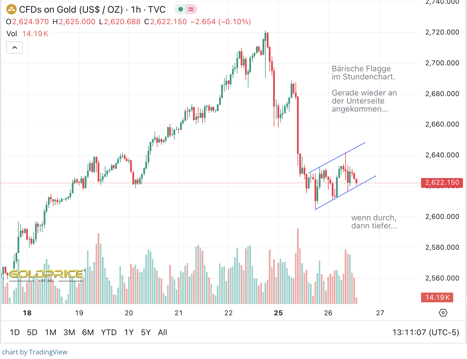 Falls der Kurs demnächst unter die 2.620 $ geht, sollten wir hoffen, daß es kein Doppeltief gibt, sondern eine klassische abc - Korrektur mit c tiefer als a.