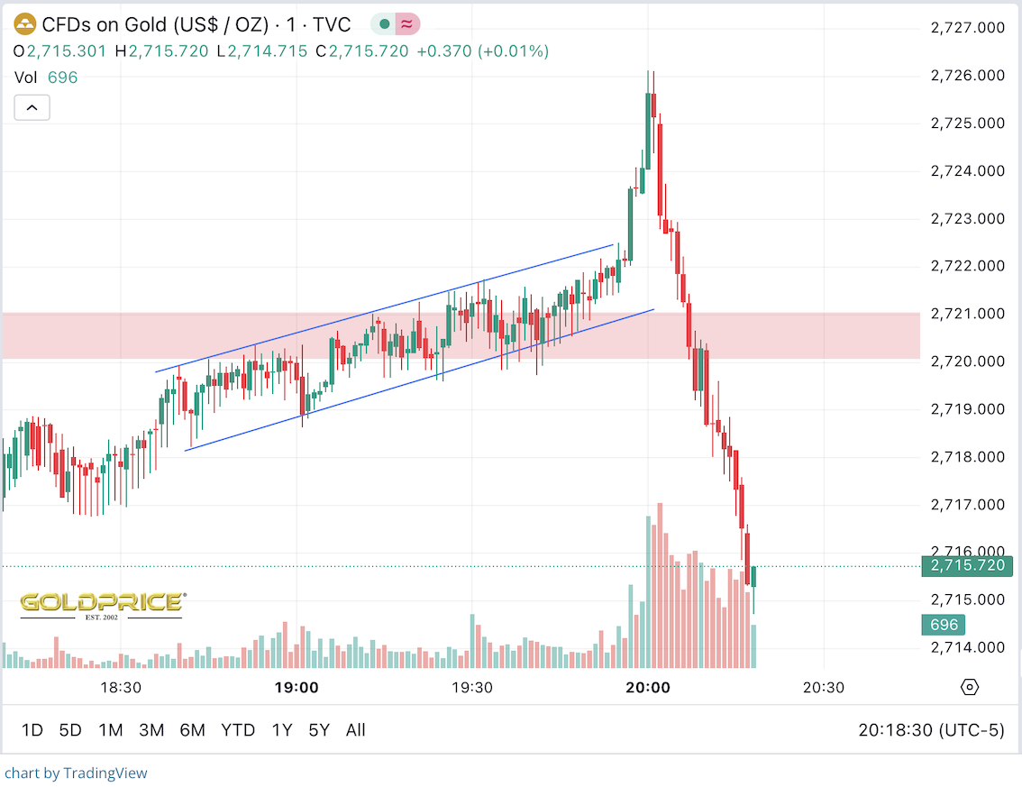 Vielleicht war das Timing ungünstig: Die USKS durchbrach den Widerstand in den letzten Handelsminuten vor COMEX-Close, der lange rote Balken der Handelsvolumen ist der Fingerabdruck der "Fettfinger", die den Kurs schnell noch mal unter die 2.720 $ drücken konnten.