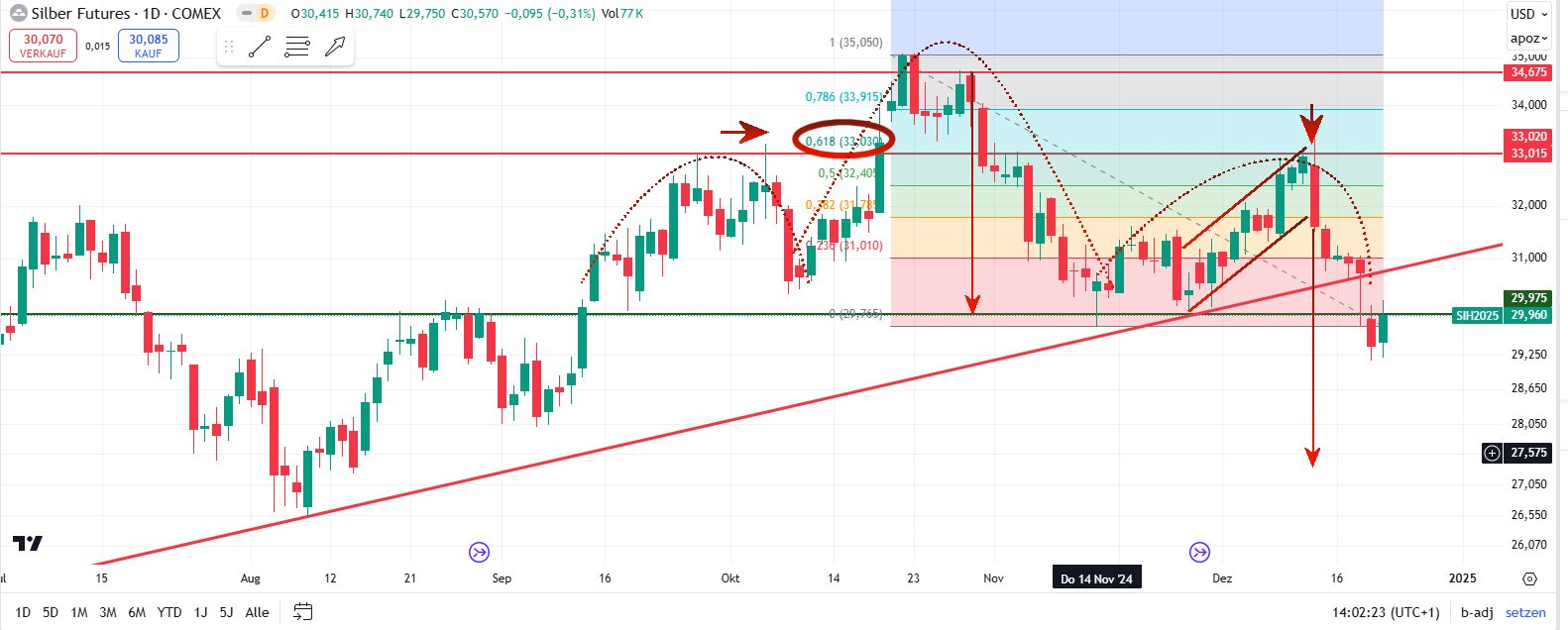 Was in gewisser Weise mit dem immer noch fehlenden 38 er Retracement von Gold 'harmonieren' täte...