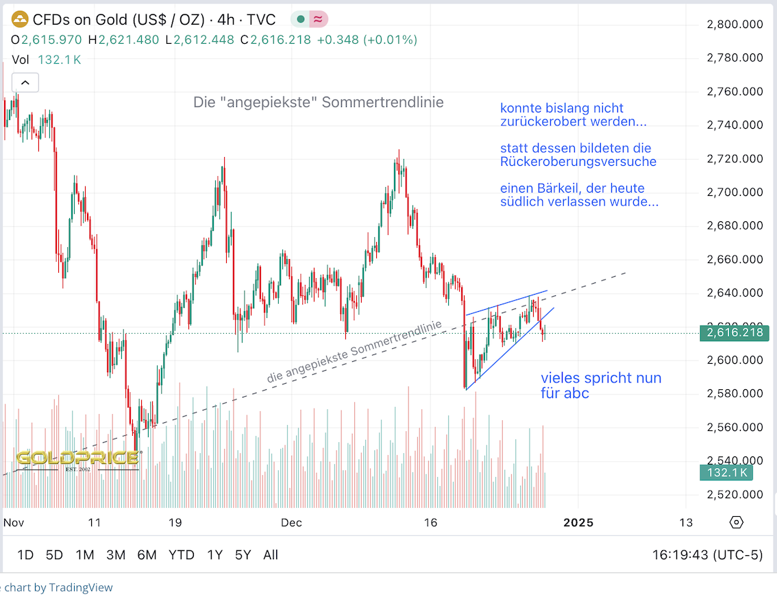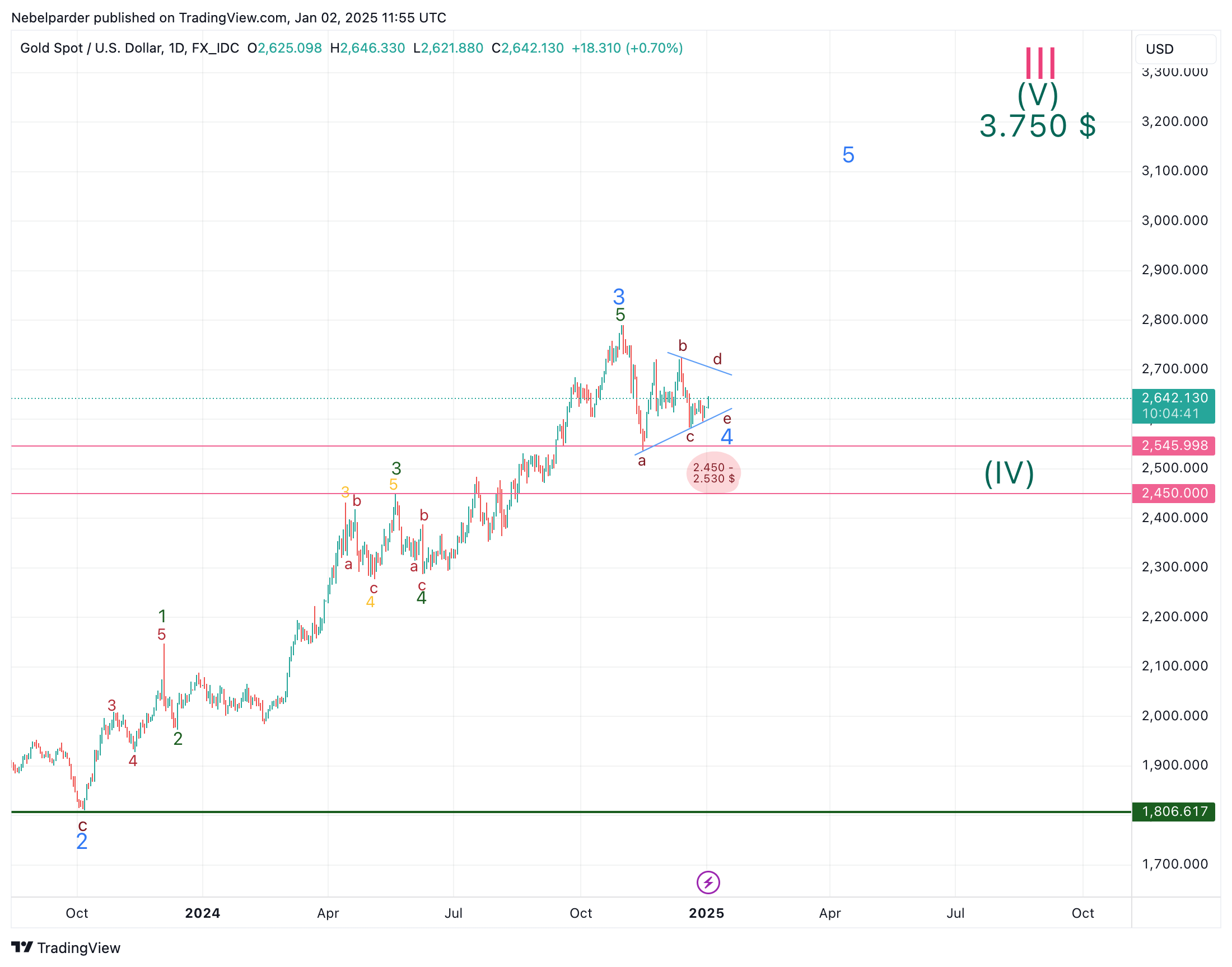 Zitat von NebelparderViel tiefer als die 2.537 $ wird es m.E. kaum gehen und am ehesten, weil es bislang so schnell ging, wird die 4 ein Dreieck werden, obwohl das relativ selten vorkommt. Wenn doch, dann aber nur in einer Welle 4 oder B. Würde also passen, wenn sich nun eine b, c, d und e in den kommenden Wochen anschließen würde (b hoch, c runter, d hoch und e wieder runter), sodass sich am Ende der Korrektur die abschließende e bei ca. 2.637 $ einfinden könnte. (so gegen Ende der Weihnachtsferien in der zweiten oder dritten Januar-Woche 2025)