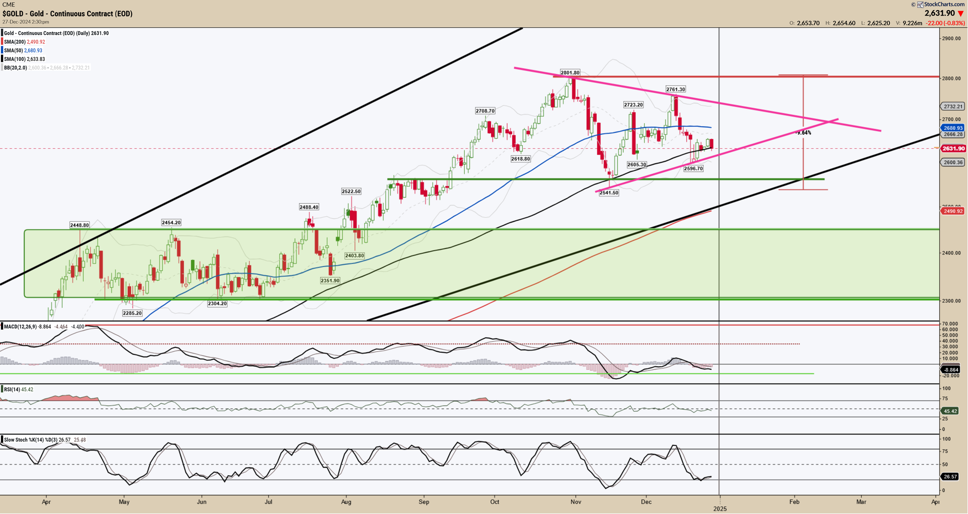 ZitatWir könnten sehen, dass Gold im Januar das November-Tief durchbricht oder testet; der Oszillator hat sich noch nicht gedreht, um eine anhaltende Korrektur anzudeuten. Dies wäre der Fall, wenn das Rot sowohl über das Blau als auch über das Gelb hinausgeht. Um ein Verkaufssignal zu erhalten, brauchen wir einen Schlusskurs UNTER 2326. Für einen Bärenmarkt würde dies durch einen Schlusskurs unter 2017 angezeigt werden.