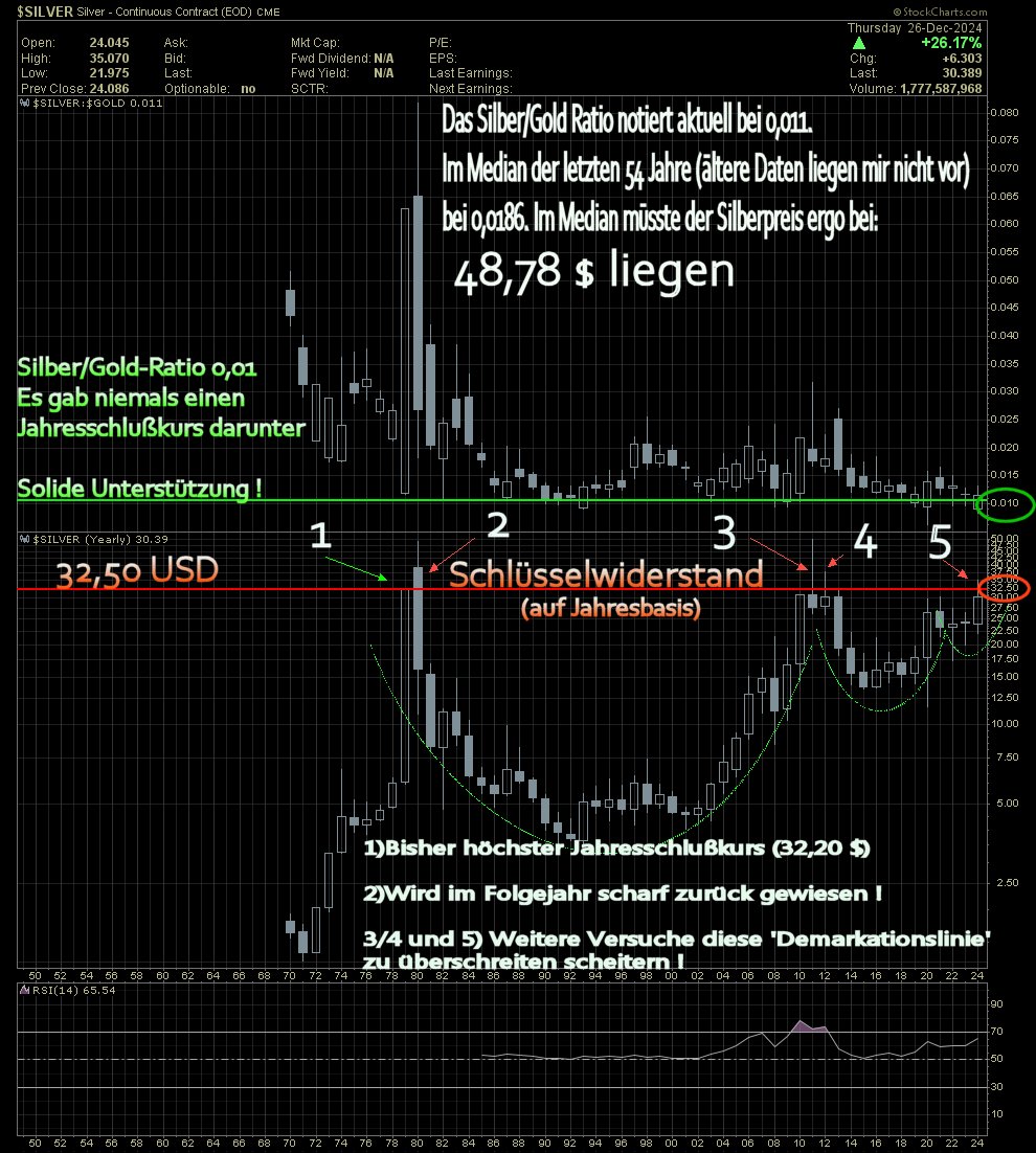 Aus meiner Sicht bei Silber also alles (noch) im grünen Bereich , auch wenn es dieses Jahr noch nichts mit einem neuen ATH auf Jahresschlußkurs-Basis wird.