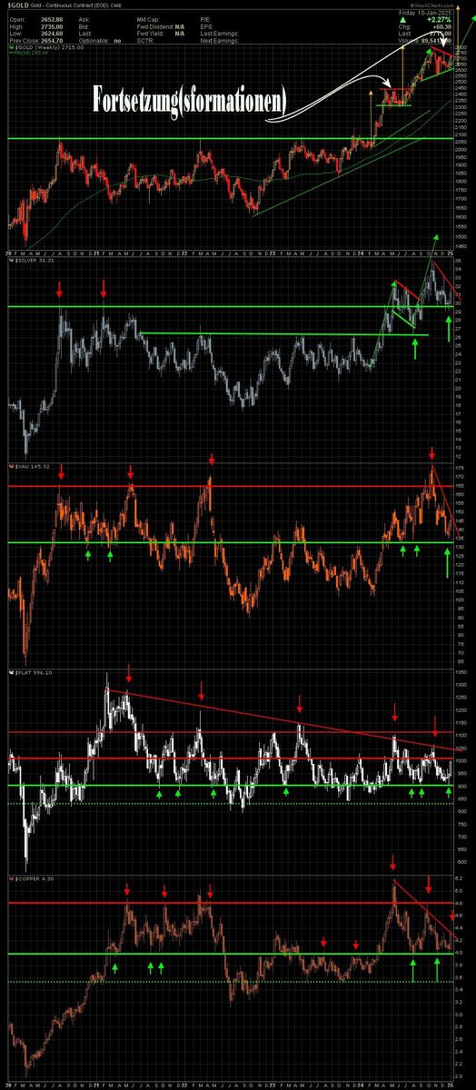hab die Kandidaten hier mal in einen Chart gestellt. Im Zentrum der Ratio-Chart (Gold/SPX) als Langfrist-Quartalschart. In weiss 5 - Jahre gleitender Durchschnitt. Die 'Rotation events' wie mit bloßem Auge erkennbar habe ich eingezeichnet.. Dass sich Gold in Relation zum SPX noch im Abwärtstrend befindet kann man so nicht bestätigen. Es gab schon mehrere (nicht nachhaltige) Trendbrüche. Ich würde aktuell von einem Seitwärtstrend sprechen.