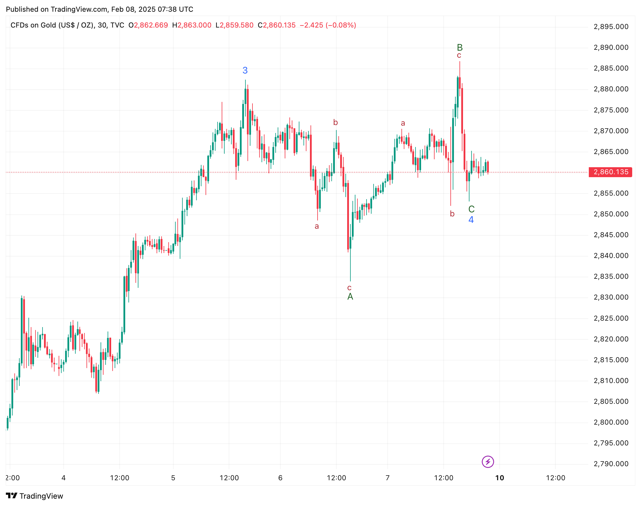 Also die Unterwelle 4 dürfte ungefähr dorthin gehen, wo wir jetzt gleich den einstweiligen Hochpunkt sehen sollten. (knapp 2.910 $; +/- versteht sich)