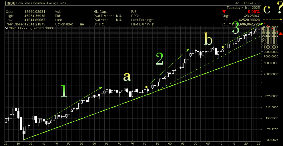Jahreskerzenchart Dow Jones: wir haben die letzten 100 Jahre drei große Aufwärtsstrecken zu verzeichnen . Die ersten beiden wurden jeweils über viele Jahre (einmal 16, einmal 12 Jahre gelb a/b) konsolidiert. Diese Konsolidierungszonen waren jeweils von starker Goldperformance begleitet. In diesem Bereich lag auch jeweils das TOP der zurückliegenden Goldbullmärkte.
