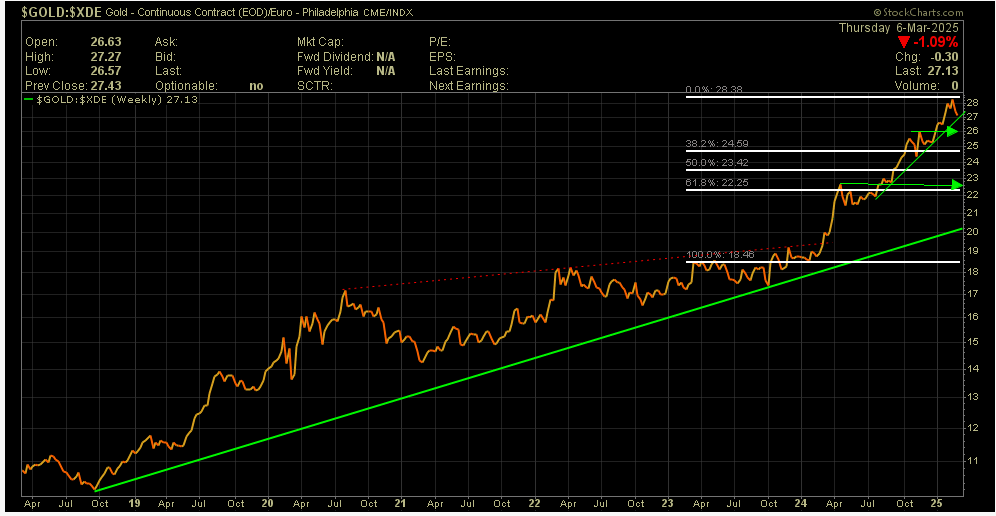 Übergeordnet ist auch bei Gold in €uro das 38 er Retracement 'offen' und aktuell bei ~ 2460. Der langfristige Aufwärtstrend liegt bei ~ ~ 2050. Da wir 2024 aus einem aufwärts gerichteten Keil nach oben ausgebrochen sind (sowas gab's beim breiten Akazienmarkt in den 90 ern, Marke wurde nie mehr unterschritten) rechne ich nicht damit , dass wir die 2 000 nochmal von unten sehen.