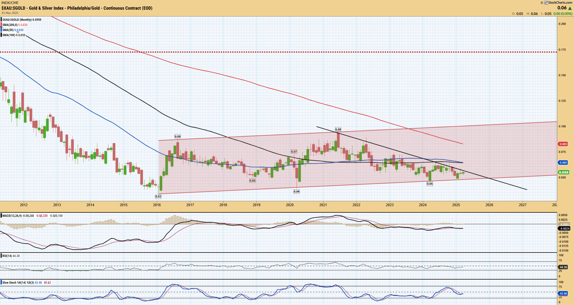Das gleiche gilt auch zu Gold, die Minen ganz weit unten...aber, der Abwärtstrend könnte geknackt werden. Fast 9 Jahre einer Bodenbildung. Es wird Zeit das wir langsam einen Wendepunkt bekommen.