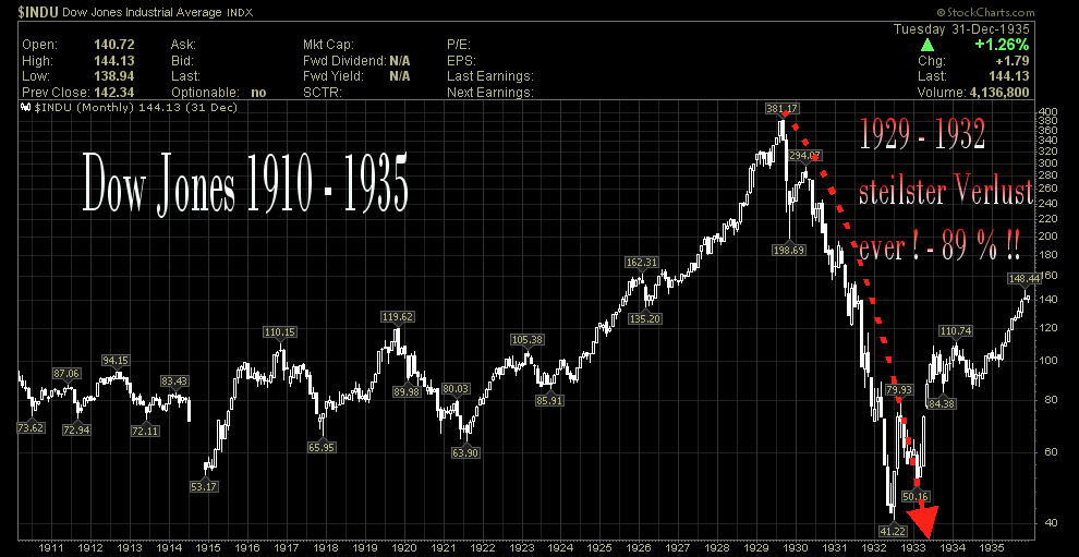 Den höchsten Verlust ausgehend vom Top markioerte der Dow in Folge der Weltwirtschaftskrise 1929 folgend mit ca. 90 % ! Damit wurde mehr als 100 % der vorangegangen Rallye ausgelöscht. Ausgehend von aktuell ~ 44 000 $ würde uns ein 90 % Absturz des Dow tatsächlich auf etwa 5 000 führen.
