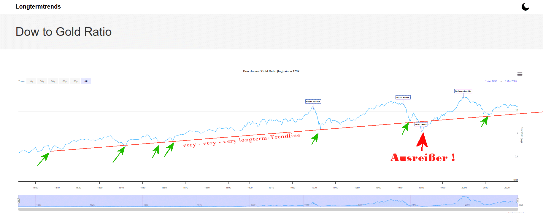 Dass der Dow aktuell bei über 40000 steht, halte ich nicht für eine faire Bewertung, Gold bei 5000 Euro schon eher, insofern ist in meinen Augen entweder das langfristige Dow/Gold Ration mit 8:1 entweder nicht richtig bewertet, oder diese Art der Betrachtung taugt generell nix. Ich tendiere zu zweitem, aufgrund Blasenbildung nehme ich solche Betrachtungen interessiert wahr, messe ihnen aber nicht allzuviel Bedeutung bei.
