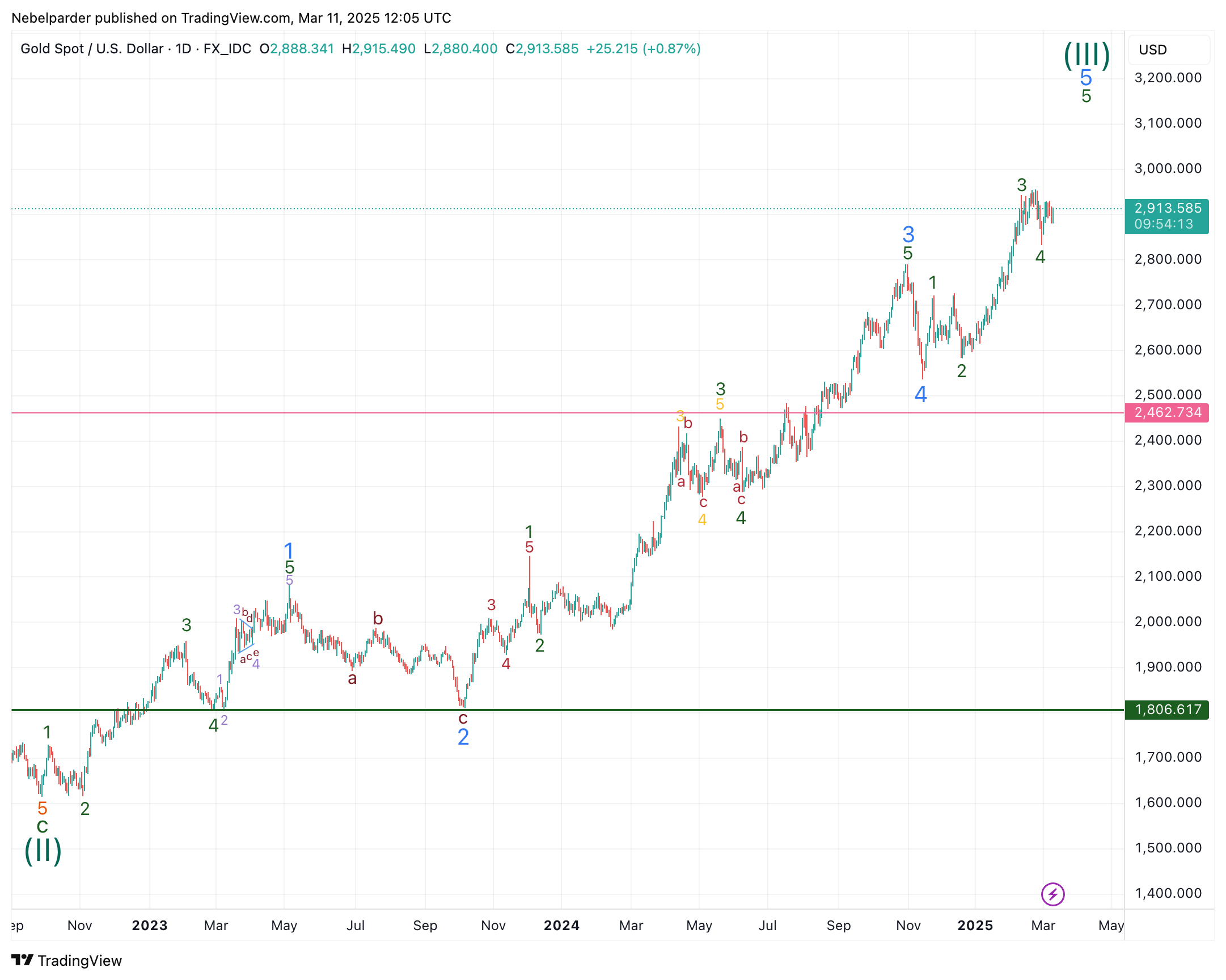 Alles anzeigenIn der kleineren Zählebene (Unterwellen der blauen 5) ergäbe sich der Bereich 3.016-3.091 $.