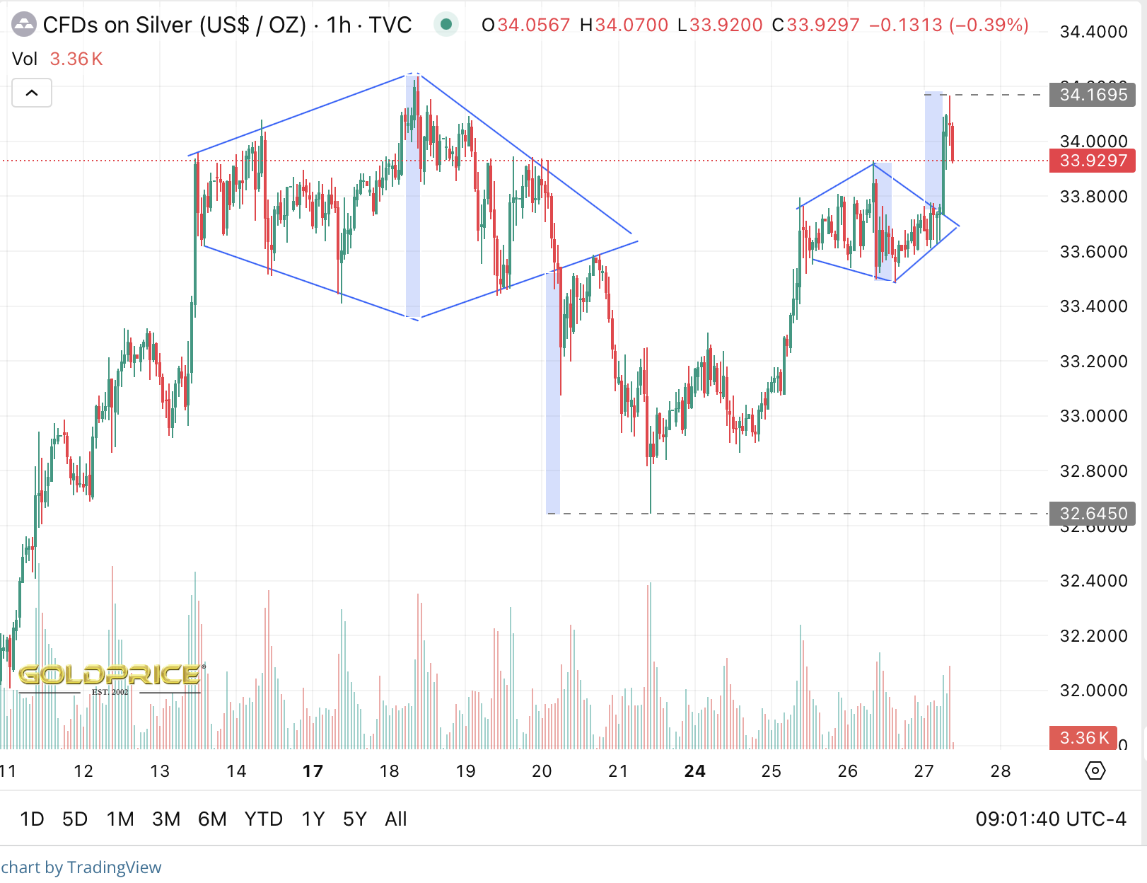 Mich würde es überhaupt nicht wundern, wenn Silber noch die 32,50 Linie von oben testen muß.