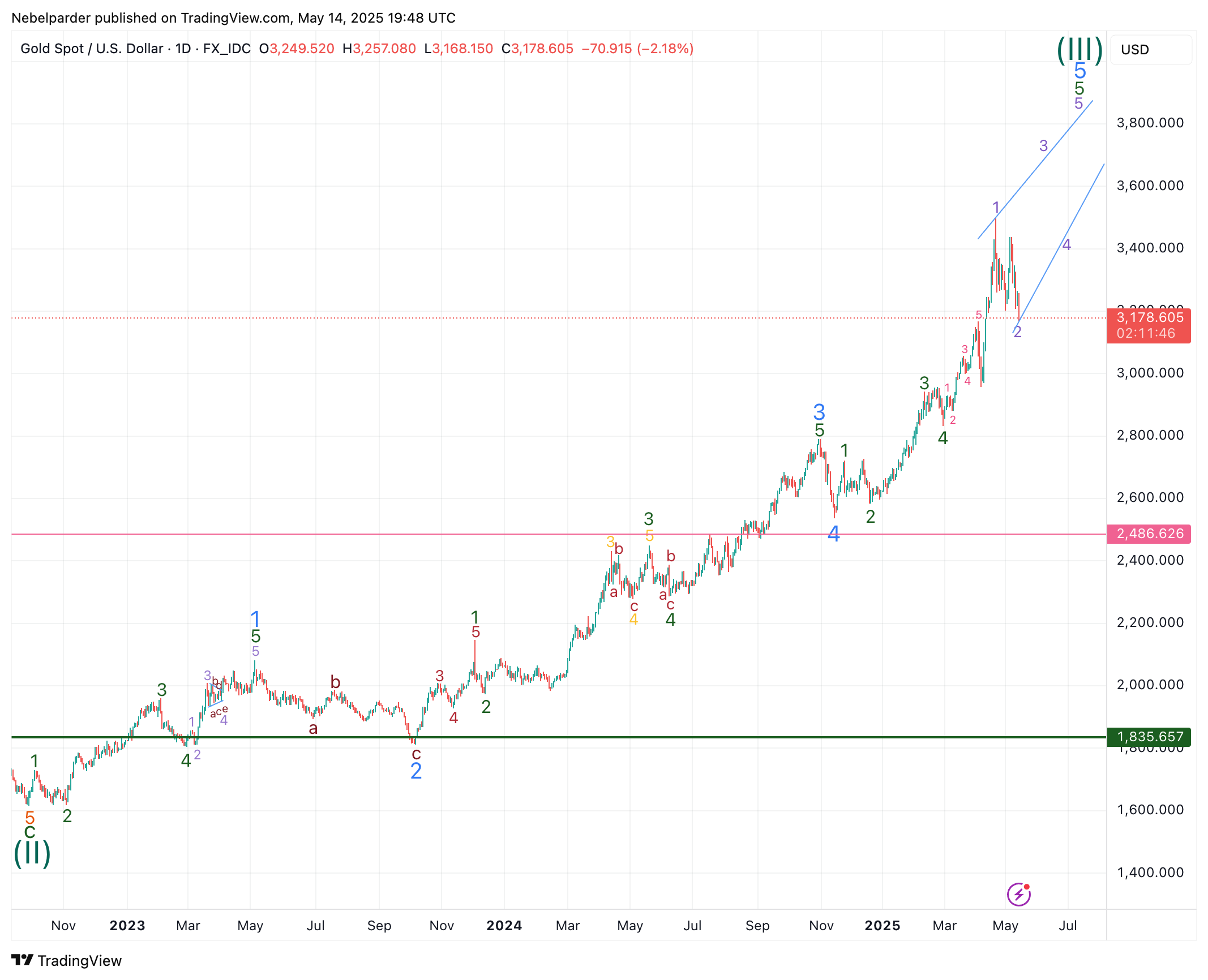 In meiner Zählung ist das erst eine noch größere 3. Dann nochmals größere, d.h. etwas längere Korrektur und dann erst Blow-Off-Topp, wo auch immer das sein wird.