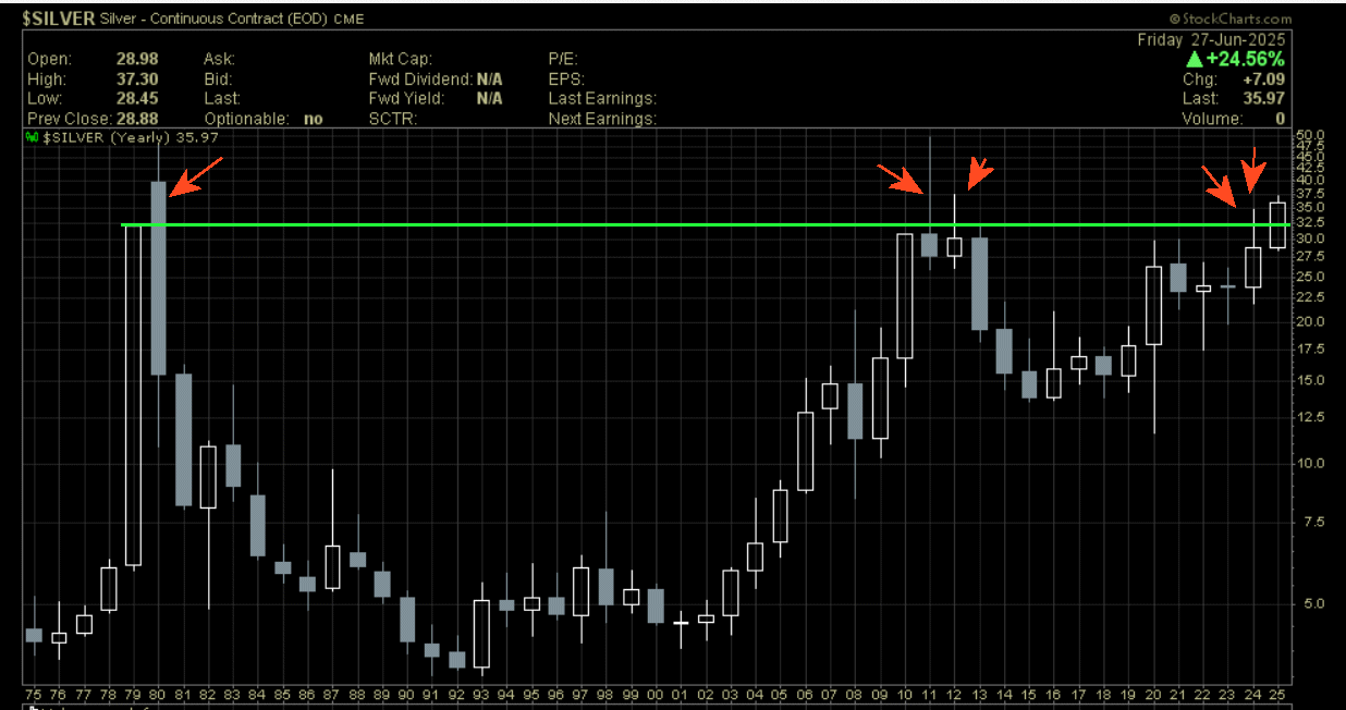 Ein wesentlicher Grund für (manipulative) Attacken ist für mich dieser Chart : Jahrescandles Silber.
