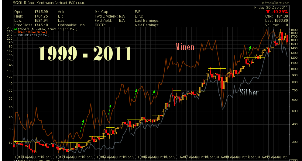 2) Die Minen waren häufig vorauslaufender 'Indikator'. (grüne Pfeile)