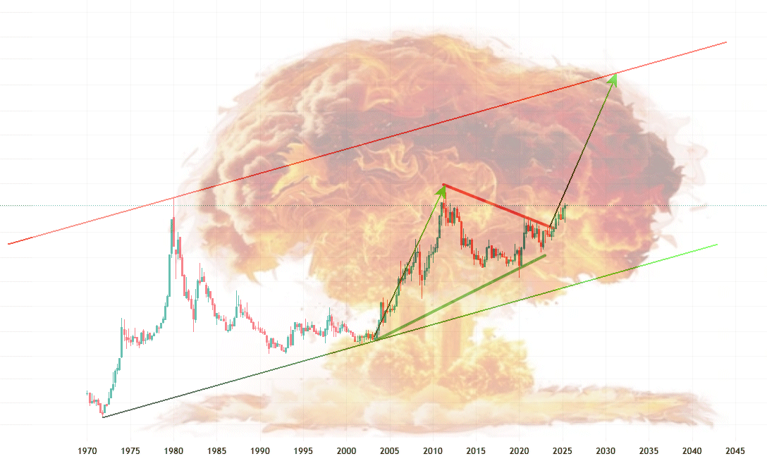 Der 'gezeigte' Aufwärts-Kanal wurde genau zweimal signifikant 'verlassen': nach oben beim Bullmarkt-Top 1980 und nach unten am Bärmarkt-Tief Anfang 2020. Und die befinden sich interessanterweise auf dem gleichen Niveau...quasi spiegelverkehrt !