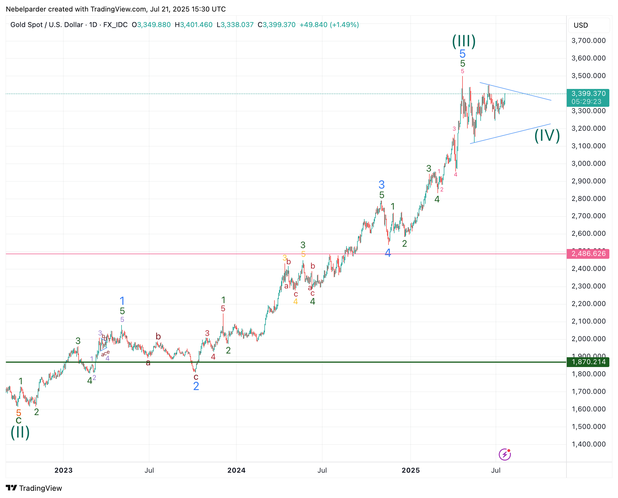 Man muss auch nicht die 3.438 $ in die Trendlinie miteinbeziehen, denn maßgebend ist die Welle D, die es noch gar nicht gibt. D.h., dass der Steigungswinkel sogar noch etwas flacher werden könnte, aber nicht muss.