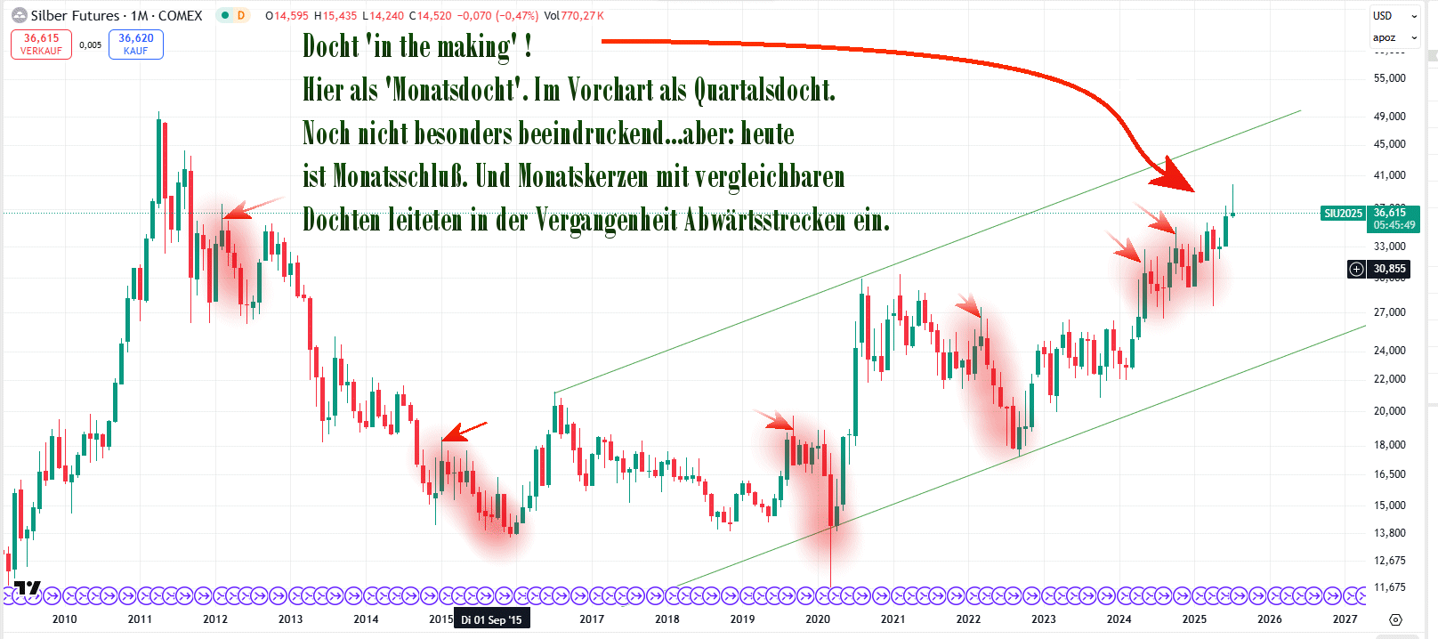 Klar, am Markt ist alles möglich. Die Technik kann nur rückblickend auf Wahrscheinlichkeiten hinweisen. In dem geposteten 15 Jahreschart findest Du keine einzige Monatskerze mit langem Docht ohne dass sich eine zumindest erkennbare Abwärtsstrecke anschließt.