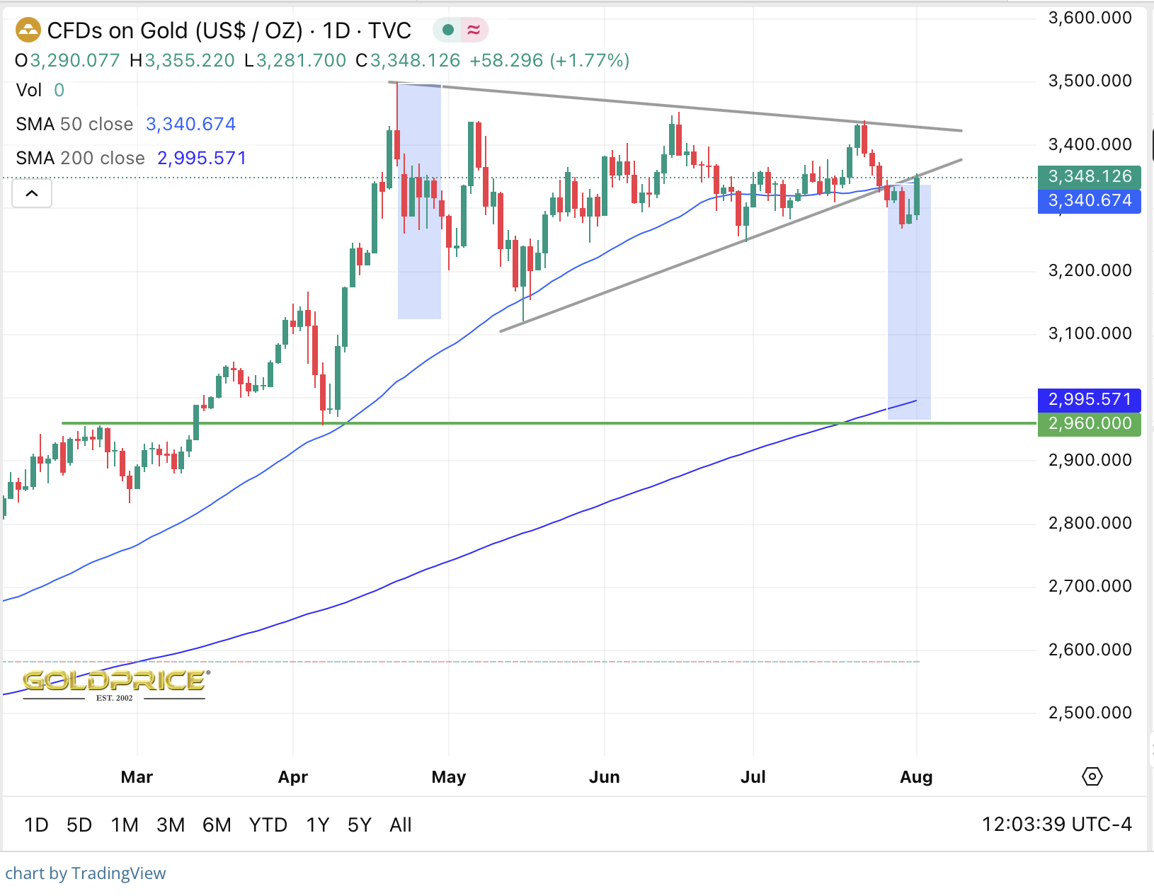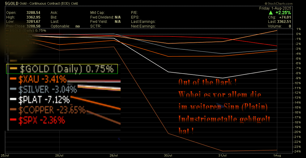 Sehr schöne grüne Tageskerze gestern bei Gold, das lässt hoffen, dass der 5. Anlauf mit Schmackes über 3450,- klappt.
