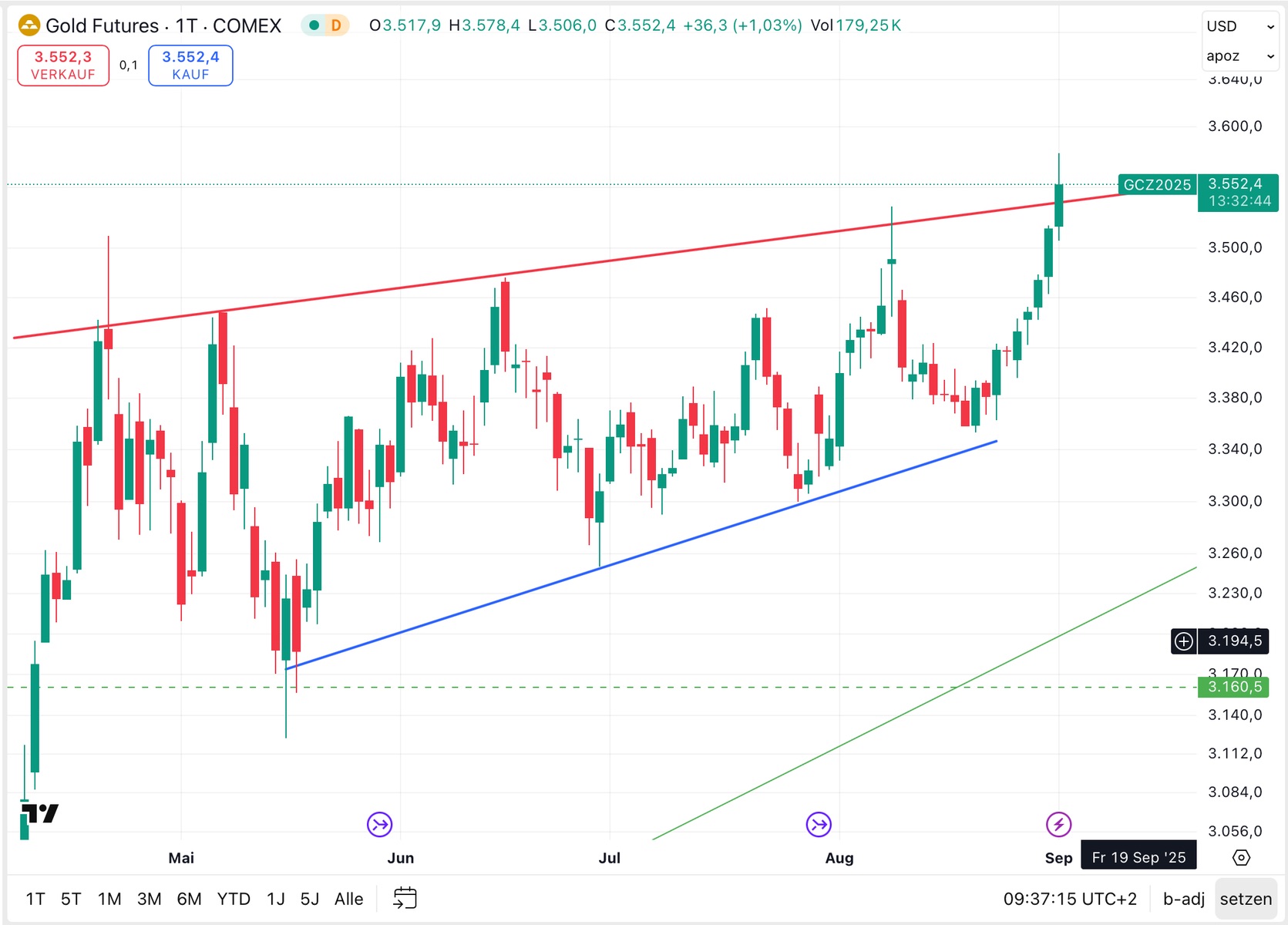 Der Knackpunkt (wurde geklingelt ?) ist zum Einen natürlich der Gesamtjahres-Trend bei beiden Vehikeln aber vor allem die sprunghafte Zunahme (bei Silber) am 01.09. !