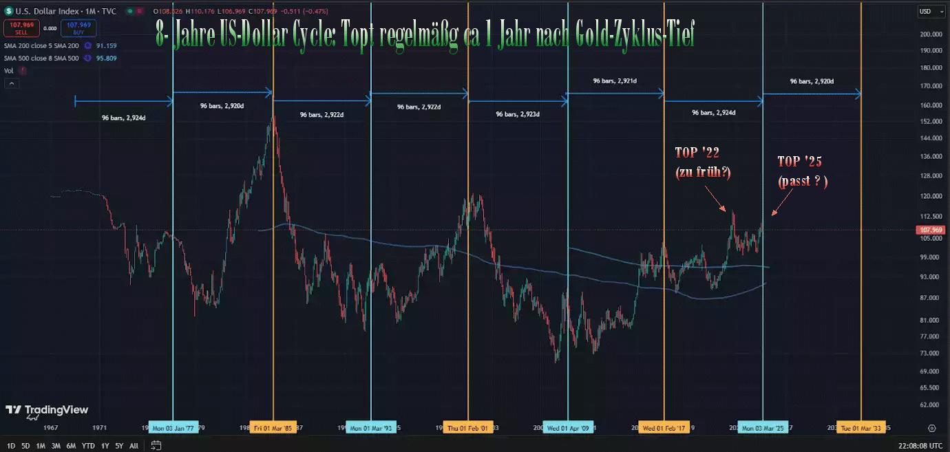 Ich denke wir werden keinen Zyklus wie Nr. 5 sehen. Das Top in diesem Zyklus dürfte mit einer wie auch immer gearteten Neuausrichtung des Finanzsystems zusammen fallen. (Währungsreform ? )