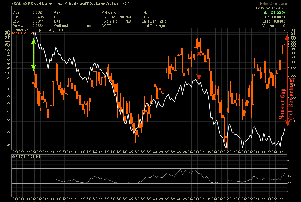 Ich bin dennoch davon überzeugt, dass mittelfristig auch bei den Minen noch einiges an Performance vor uns liegt. Siehe hierzu die relative Bewertung der Minen zum breiten Aktienmarkt. Auf dem Langfristchart ist deutlich ein Monster-Bewertungsgap zu sehen: