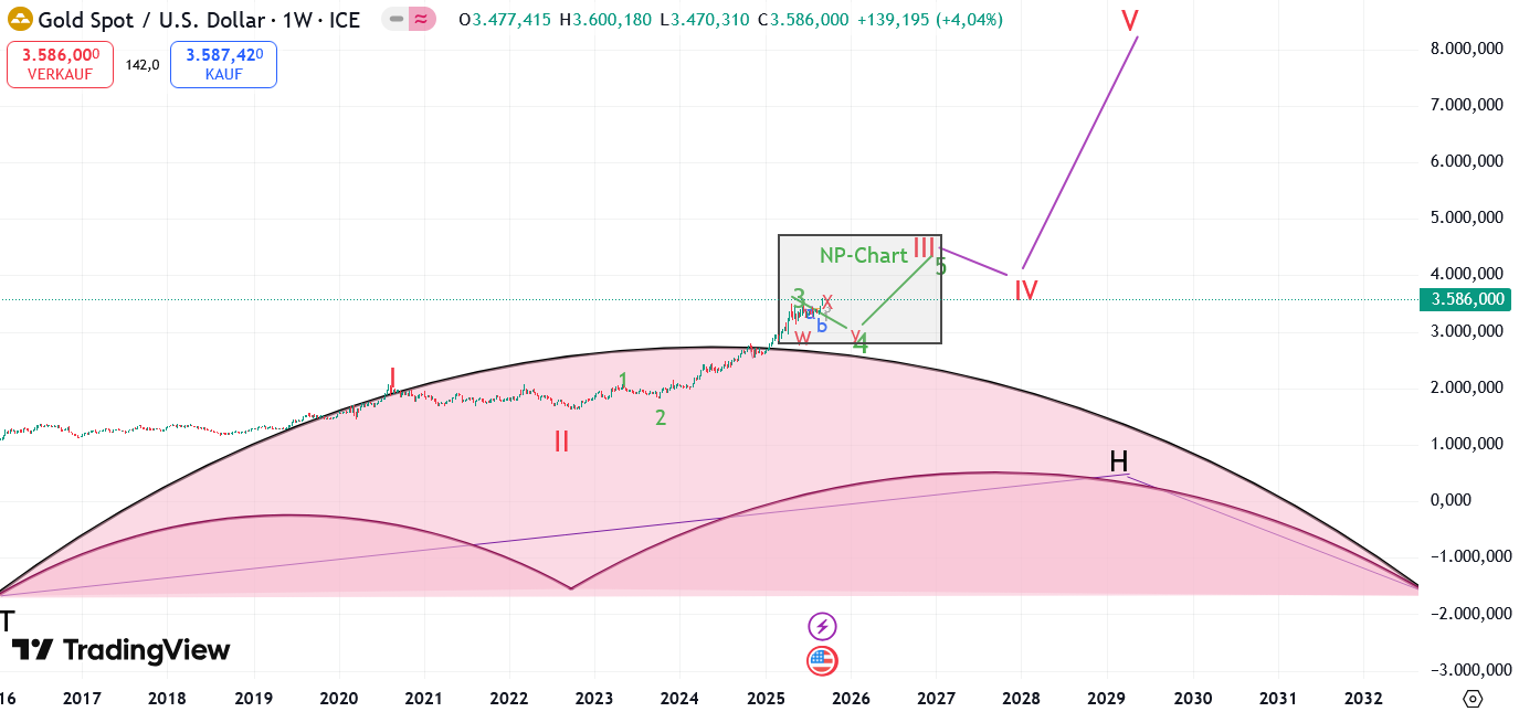 Danach müssen wir mit 1 Jahr erneuter Korrektur rechnen ! Und dann käme die V , die noch viel höher führt (nach NP`s chart).