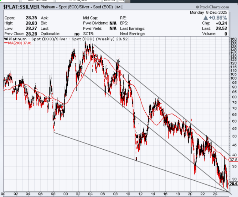 Sowas könnte schneller kommen als Du glaubst. Platin braucht nur kurz auf 1000 (oder 1250) USD abzutauchen, während das Silber auf 67 (oder 83) USD steigt. Dann wären wir da.