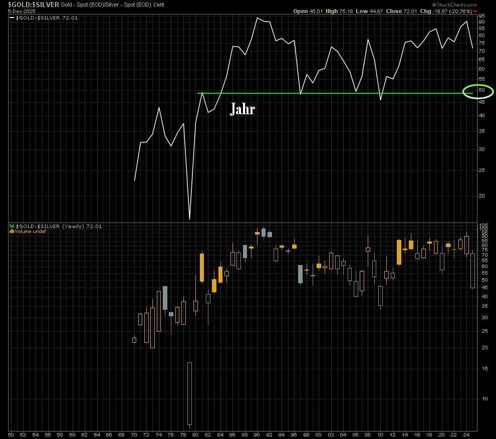 Hab' das Boot schon gut voll...ohne 'zu tauschen'. Ich halte bewußt beides...aber wo wir gerade bei 'relativer Bewertung' sind: Gold/Silver Ratio on track zu...?