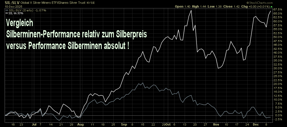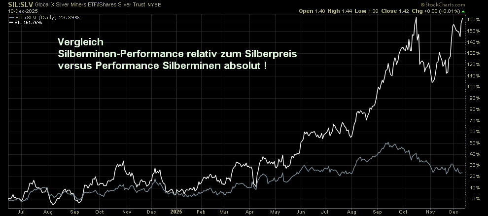 Auf den ersten Blick ist das 'unauffällig' , weil absolut gesehen die Silberminen sogar etwas besser performt haben als die Goldminen. (unteres Chartfenster) Allerdings hat eben Silber den Goldpreis gewaltig outperformt.