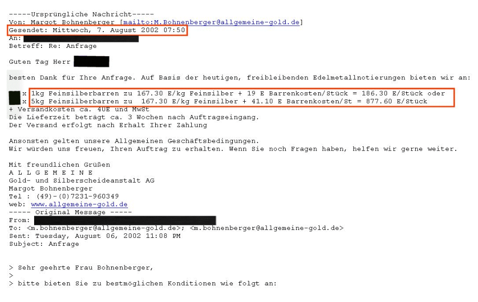 By the way, , Kilopreis 2002 bei der Scheideanstalt 186 €. heute preiswertester Anbieter bei gold.de 2270 €...entspricht einer jährlichen 'Rendite' von 11,5 %...also sooo exorbitant ist das auch wieder nicht.
