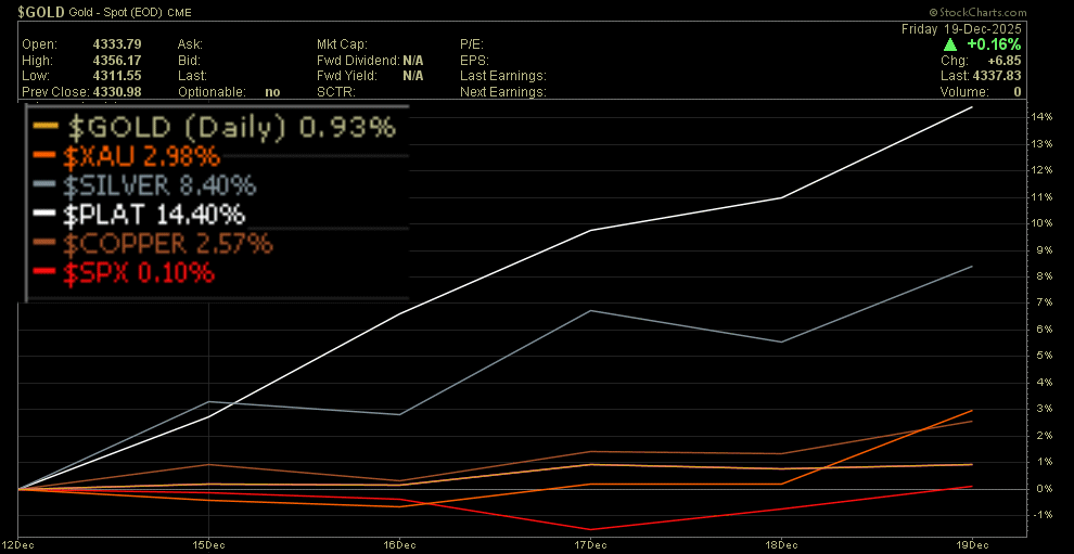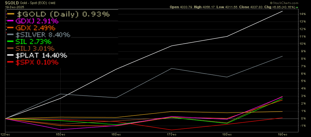 Hier mit den 'zugehörigen' Kapitalmarktvehikeln: Minen-ETF's: GDX/GDXJ/SIL/SILJ , alle liegen um die 3 % plus