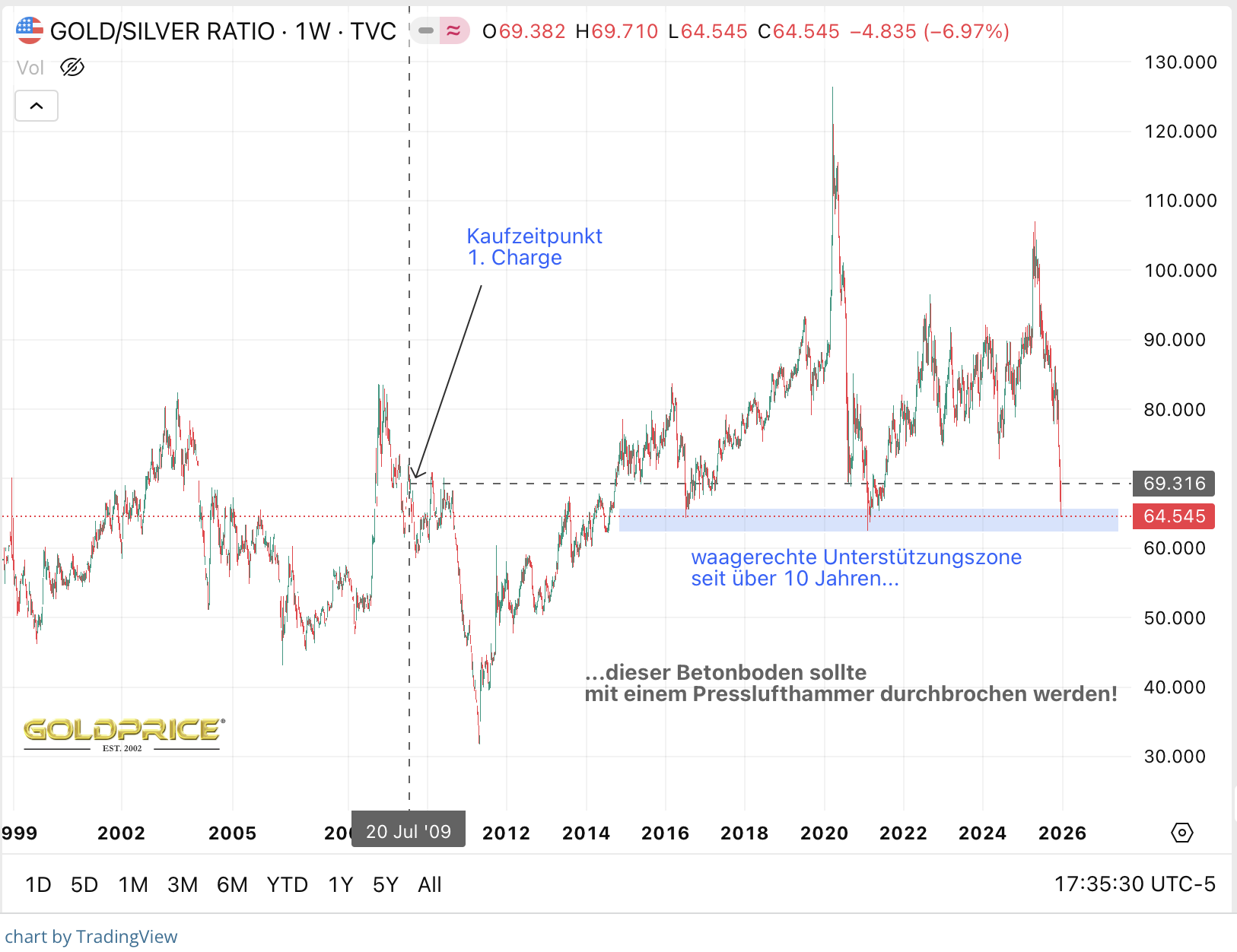 Dieser Tage erreichen wir gerade eine spannende Stelle im Chart des GS-Ratios: Diesmal muß der Betonboden pneumatisch nach Süden durchstoßen werden, damit die Silberrakete wirklich fliegt...