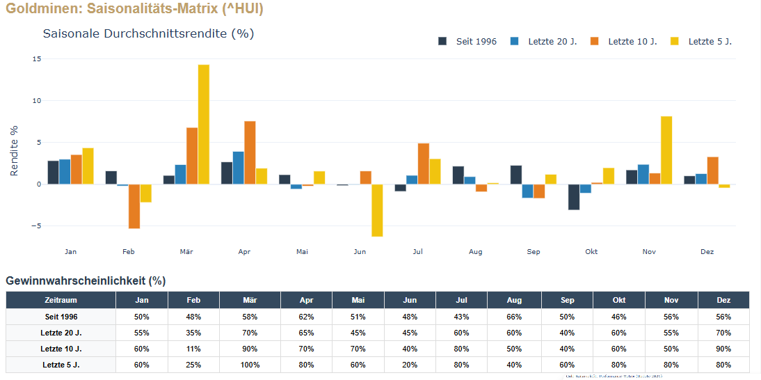 Speziell für die nächsten Monate: Betrachtet man die letzten 5 und 10 Jahre und schaut da speziell auf die Durchschnittsrendite von Gold und den Goldminen, fällte eine Outperformance der Minen ab März auf. Der Februar ist statistisch allerdings noch schwach.....