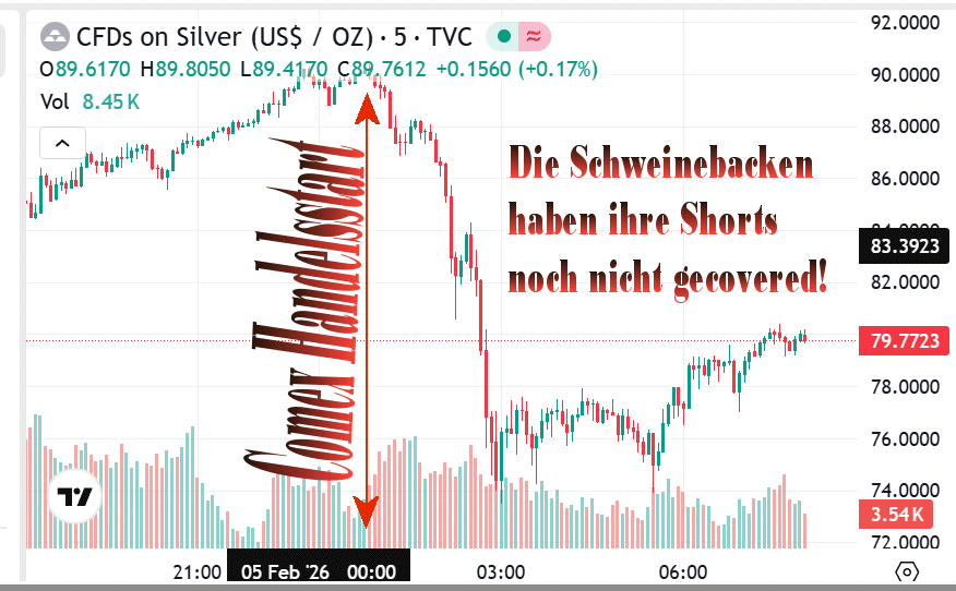 Sieht schon witzig aus, dass die Silberkerze heute genau zwischen EMA und unterem BB passt.